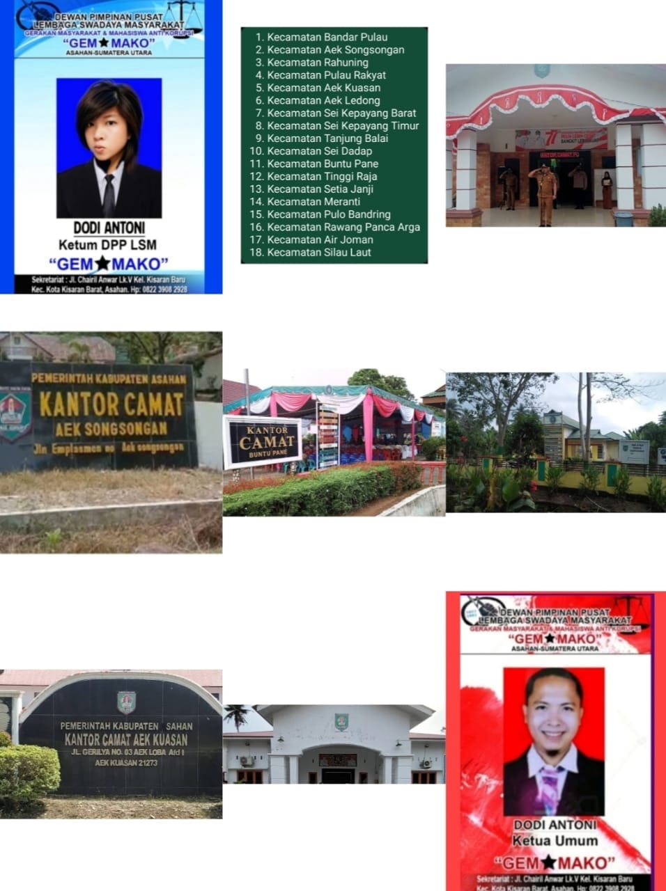 Asahan//Formappel.com | Dari 25 Camat Se Kabupaten Asahan Dodi Antoni Ketua Umum Dewan Pimpinan Pusat Lembaga Swadaya Masyarakat Gerakan Masyarakat dan Mahasiswa Anti Korupsi Kabupaten Asahan Provinsi Sumatera Utara Republik Indonesia (Ketum DPP LSM GEMMAKO ASAHAN SUMUT RI) meminta kepada Kepala Kejaksaan Negeri Kisaran dan Kapolres melalui Unit Tipikor Polres Asahan untuk memeriksa 18 Camat kecuali Camat Kecamatan Mandoge, Camat Kecamatan Kota Kisaran Barat, Camat Kecamatan Kota Kisaran Timur, Camat Kecamatan Air Batu, Camat Kecamatan Teluk Dalam, Camat Kecamatan Sei Kepayang Induk, dan Camat Kecamatan Simpang Empat karena dalam laporan beberapa kepala desa dan warga telah melaporkan kepada lembaga dan awak media terkait Dugaan Pengutipan Liar (Pungli) untuk kegiatan dana MTQ di Tingkat Kecamatan Se- Kabupaten Asahan.