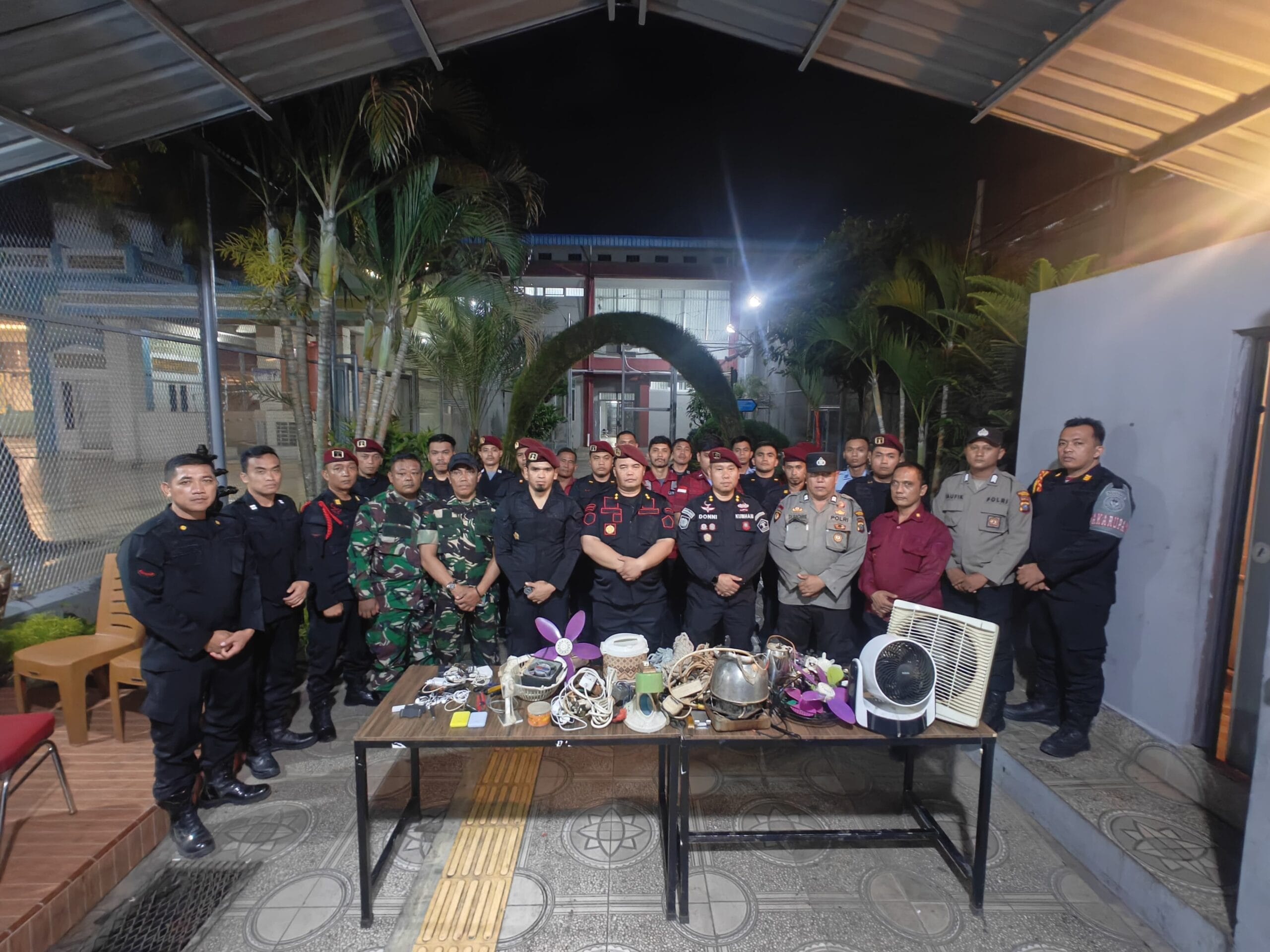 Sementara, hasil penggeledahan kamar hunian petugas, telah ditemukan antara lain 4 unit ponsel, 14 unit charger HP, headset 7 unit, tripod 2 unit, rice cooker 1 unit, kipas angin 5 unit, pemanas air 2 unit, exhaust van 2 unit, colokan sambung, power bank 1 unit, cutter 3 bilah, gunting 6 bilah, tang, sendok nasi, kabel sepanjang 4 meter, tali tambang 7 gulung, gunting kuku dan satu set kartu remi. Semua barang bukti yang ditemukan itu, selanjutnya langsung dimusnahkan.