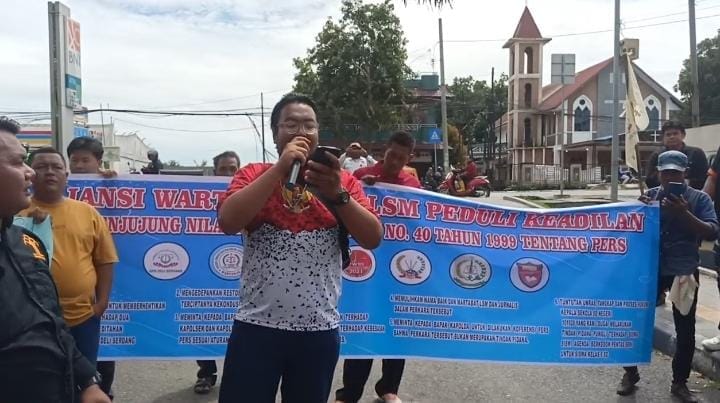 Puluhan insan pers dan Lembaga Swadaya Masyarakat (LSM) yang tergabung dalam Aliansi Wartawan dan LSM Peduli Keadilan menggelar aksi damai di depan Markas Kepolisian Daerah Sumatera Utara (Mapolda Sumut), Jalan Sisingamangaraja Km 11, Medan, Selasa 10/6/2025.