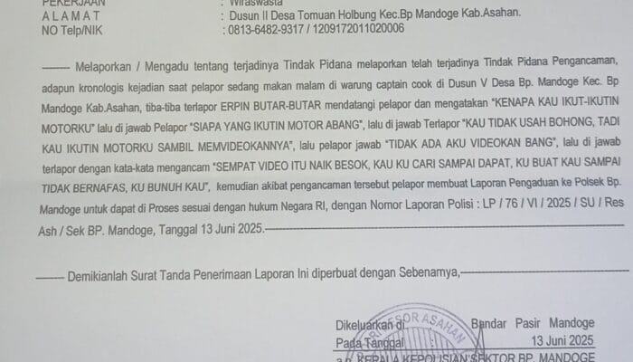 Asahan//Formappel.com – Hengky warga Kecamatan BP Mandoge Kabupaten Asahan melapor ke Polsek BP Mandoge atas Tindak Pidana Pengancaman yang dilakukan Erpin Butar-butar Pelaksana CV. Nusantara Putra Doge Vendor PTPN IV BP Mandoge.
