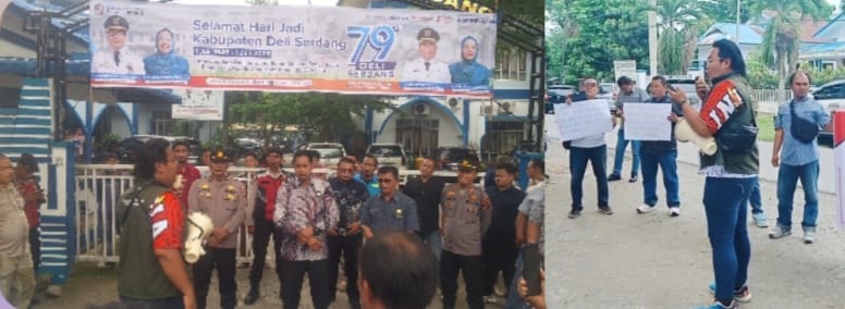 Aksi unjuk rasa yang digelar Aliansi Sahabat Anak Deli Serdang berlangsung panas di depan Kantor Dinas Pendidikan Kabupaten Deli Serdang, Jumat (20/6/2025).