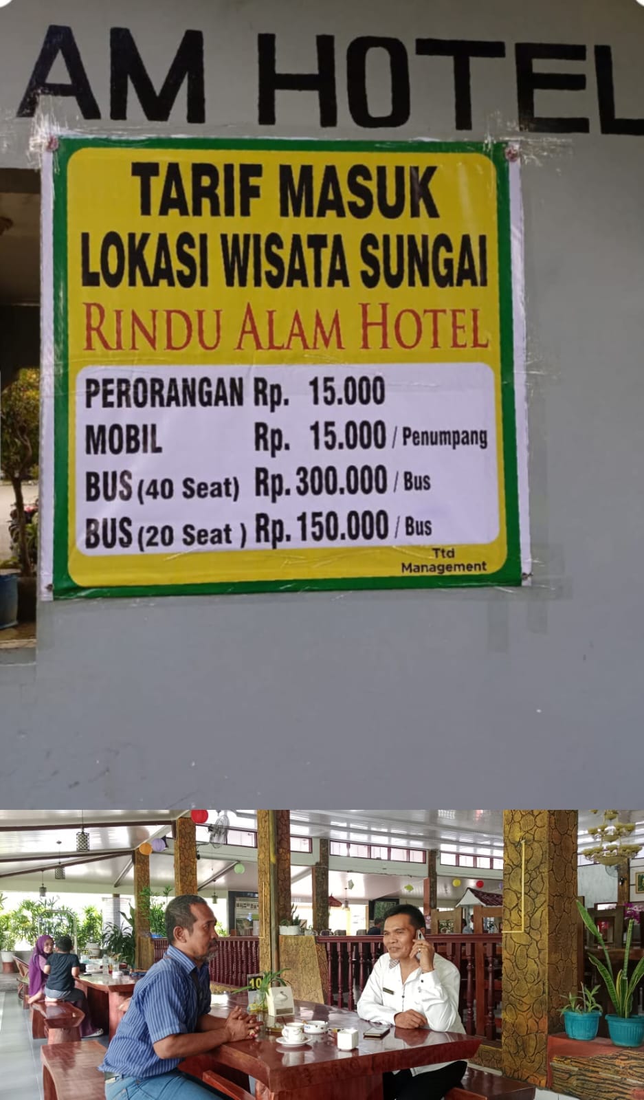 “Saya baru mengetahui hal ini, Kami meminta maaf atas kesalah pahaman ini. Maksudnya tarif masuk tersebut bukan dilokasi sungai, ada kesalahan penulisan pada binner tersebut. Namun itu bagi tamu yang tidak menginap yang ingin menggunakan areal pekarangan Rindu Alam Hotel.