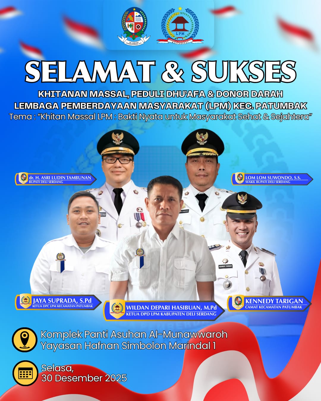 Di tengah euforia pergantian tahun yang kerap diwarnai pesta dan hura-hura, Lembaga Pemberdayaan Masyarakat (LPM) Kecamatan Patumbak memilih jalan berbeda. Menutup kalender tahun 2025, LPM Patumbak justru hadir dengan aksi kemanusiaan yang menyentuh nurani: khitanan massal, santunan dhu’afa, dan donor darah.