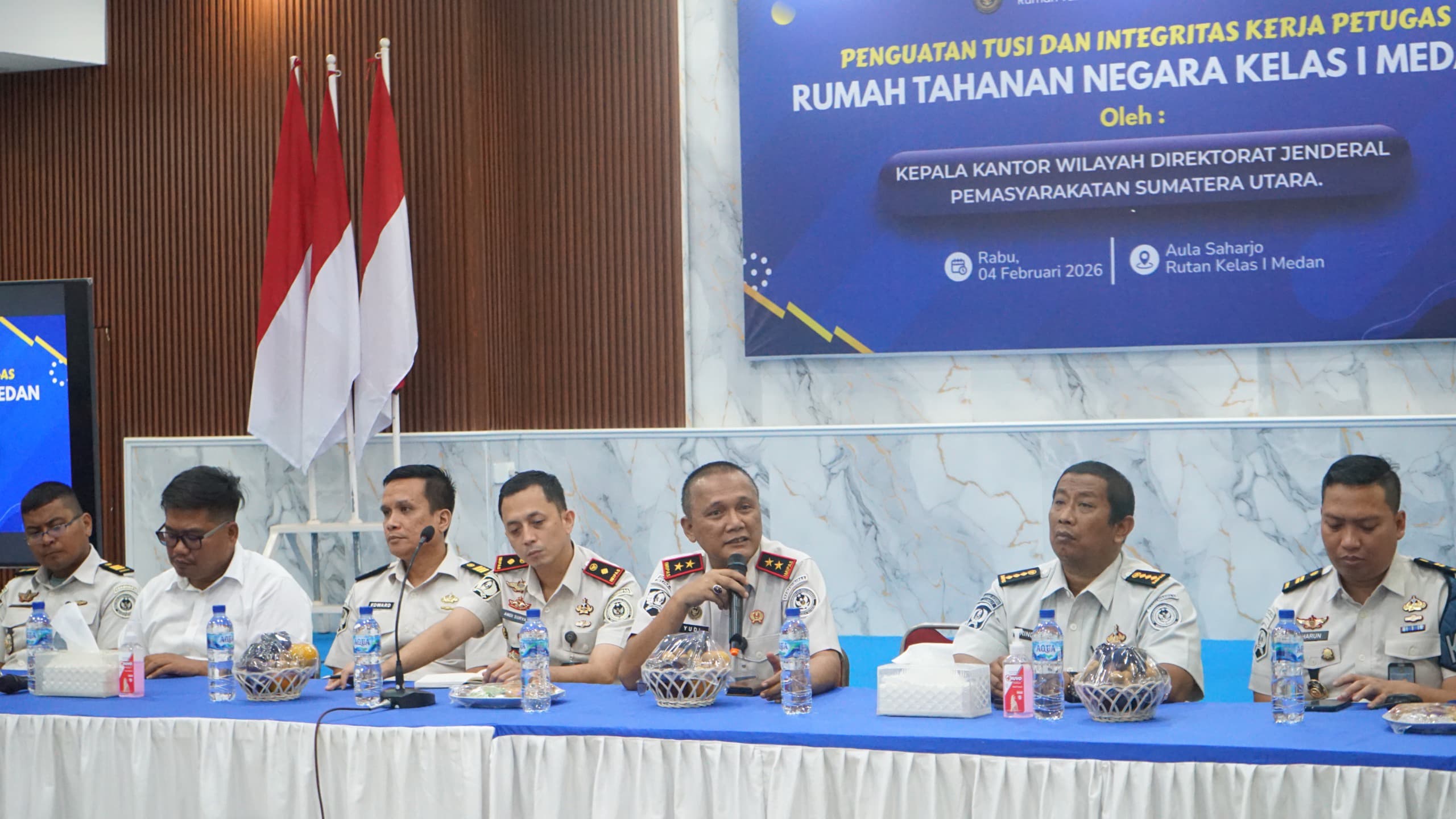 Rumah Tahanan Negara (Rutan) Kelas I Medan menerima penguatan dari Kepala Kantor Wilayah Direktorat Jenderal Pemasyarakatan Sumatera Utara (Kakanwil Ditjenpas Sumut), Yudi Suseno, yang menekankan pentingnya integritas, profesionalisme, dan kesiapsiagaan petugas pengamanan, Rabu (4/2/2026), bertempat di Aula Sahardjo Rutan Kelas I Medan.
