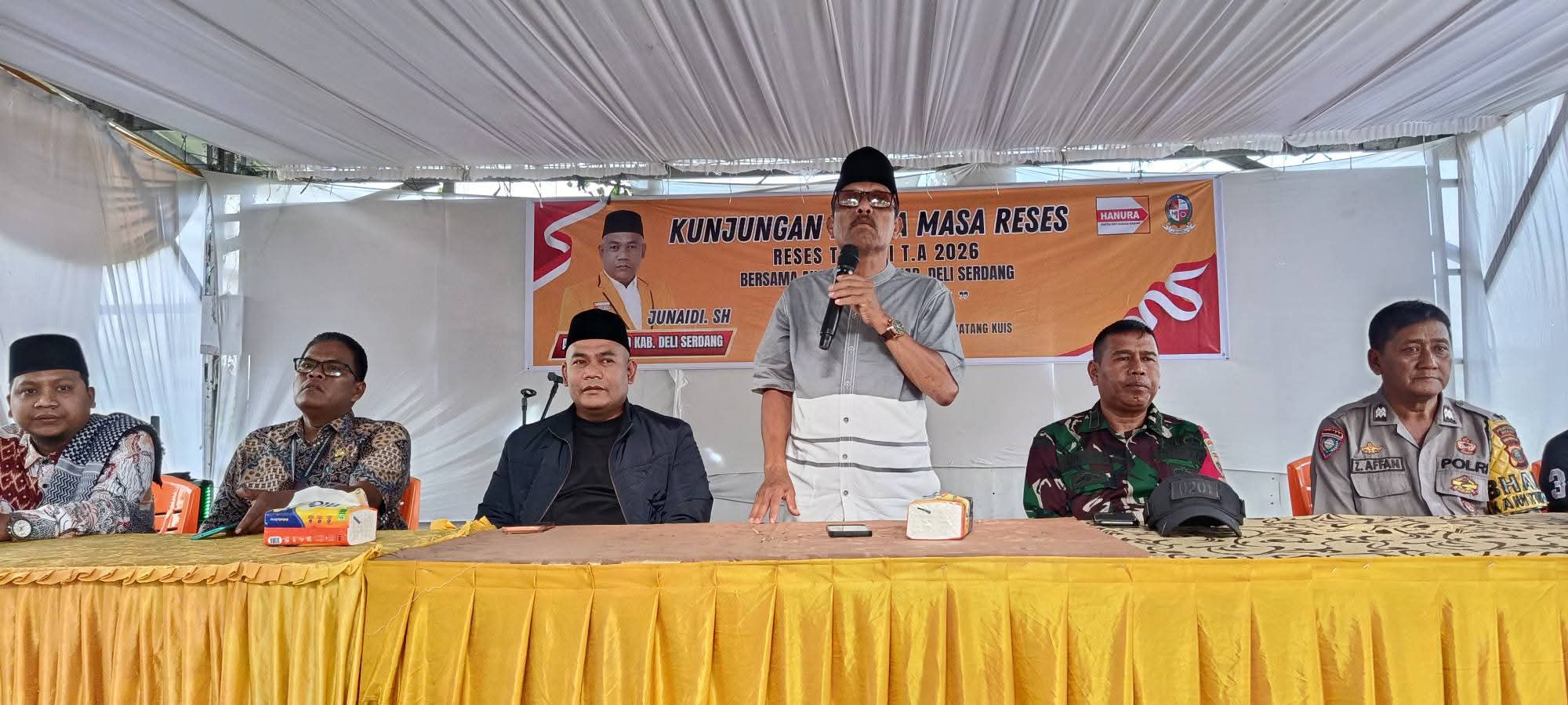 Anggota DPRD Kabupaten Deli Serdang dari Fraksi Partai Hanura, Junaidi, SH, melaksanakan kunjungan kerja masa reses Tahap I Tahun Anggaran 2026 dengan menyerap langsung aspirasi masyarakat di Pasar 7 Tembung, Desa Bandar Klippa, Kecamatan Percut Sei Tuan, Kamis (12/03/2026).
