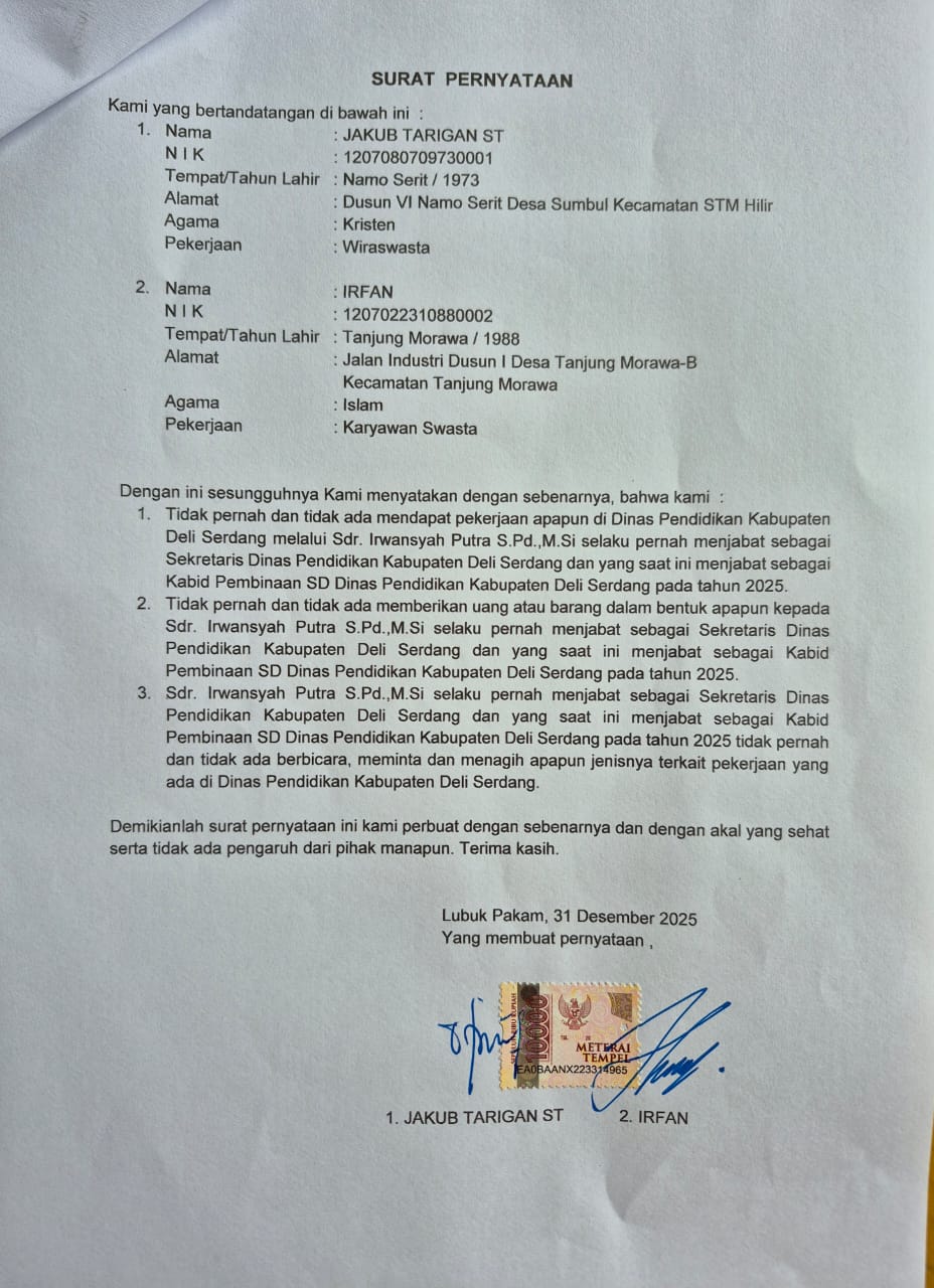 Bantahan itu tidak hanya disampaikan secara lisan. Sebuah surat pernyataan bermaterai tertanggal 31 Desember 2025 turut dimunculkan sebagai penguat. Dokumen tersebut ditandatangani oleh Jakub Tarigan ST dan Irfan—dua nama yang disebut-sebut terkait dalam isu ini.